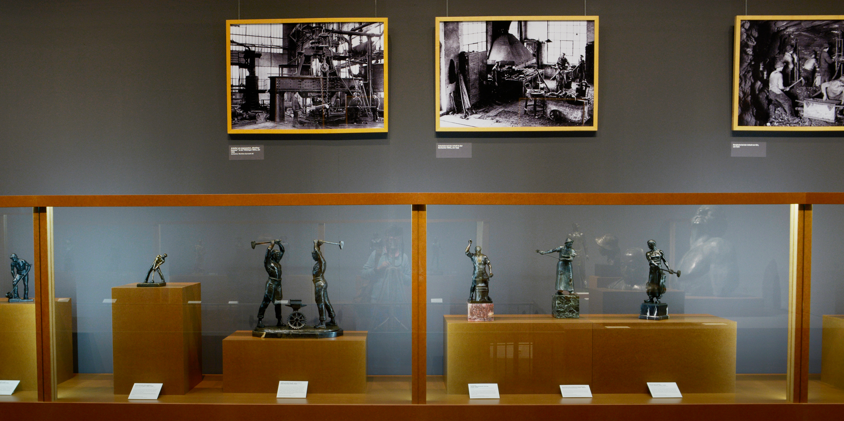 Den bis zu 1 Meter großen Plastiken stellte das Historische Musum Saar 28 großformatige Fotos aus der Saarregion gegenüber, die nur scheinbar objektiv die Realität der industriellen Arbeitswelt dokumentieren. Bei näherem Hinsehen erweisen sie sich, ebenso wie die Plastiken, als Inszenierungen von Arbeit.
