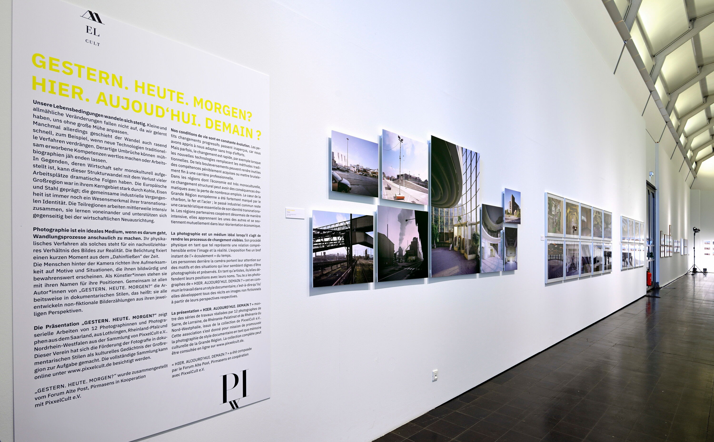 Die Präsentation „GESTERN. HEUTE. MORGEN?“ zeigt serielle Arbeiten von 13 Photographinnen und Photographen aus dem Saarland, aus Lothringen, Rheinland-Pfalz und Nordrhein-Westfalen aus der Sammlung von PixxelCult e.V.. Dieser Verein hat sich die Förderung der Fotografie in dokumentarischen Stilen als kulturelles Gedächtnis der Großregion zur Aufgabe gemacht. Die vollständige Sammlung kann online unter www.pixxelcult.de besichtigt werden.