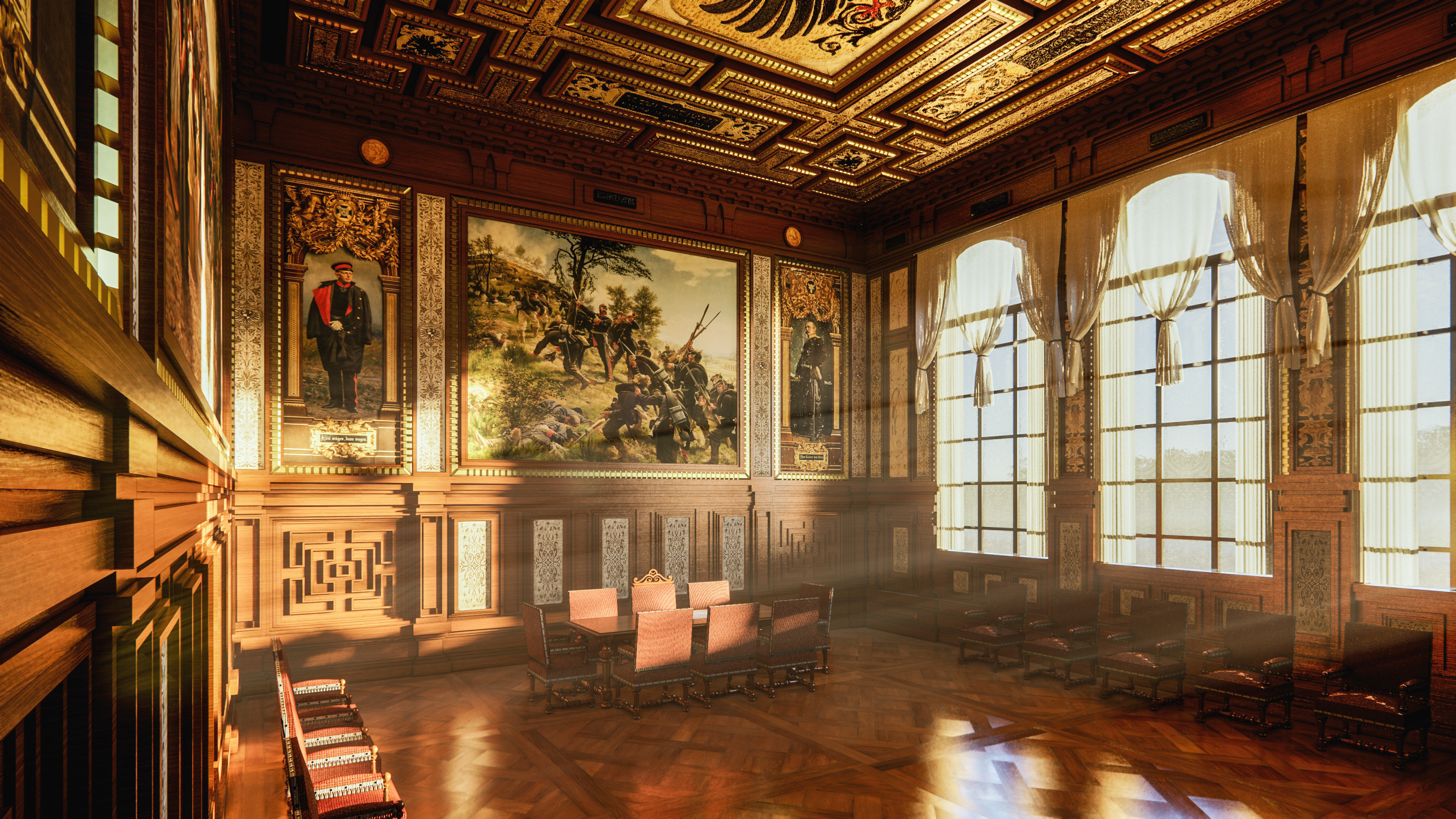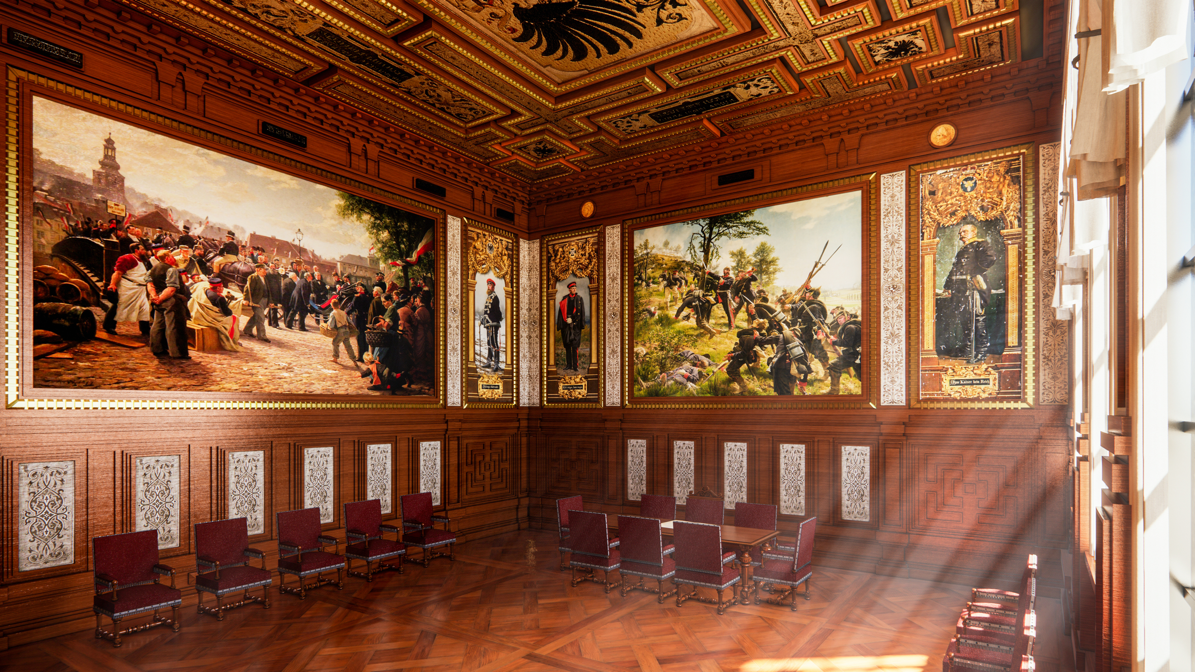 Anhand von historischen Fotos haben wir den Rathaussaal virtuell rekonstruiert. In der Ausstellung wurde die Inszenierung jedoch aufgebrochen. Die Gemälde hingen nicht mehr in ihrer ursprünglichen Anordnung und rund 1,5 Meter tiefer. Die Projektion der Pop-Art-Interpretation der Werke des Saarbrücker Rathauszyklus durch den Künstler Moritz Götze an die Decke der Ausstellungshalle brach das ursprünglich intendierte Pathos der Gemälde. Zu sehen waren auch zahlreiche Vorzeichnungen, die Anton von Werner 1876 und 1878 in Saarbrücken anfertigte. Das größte Gemälde des Bilderzyklus wird bis Ende 2021 live im Untergeschoss restauriert und wurde in der Ausstellung durch das Vorgemälde aus dem Deutschen Historischen Museum vertreten. Nach der Ausstellung und Restaurierung werden die Gemälde im Museumsdepot aufbewahrt.