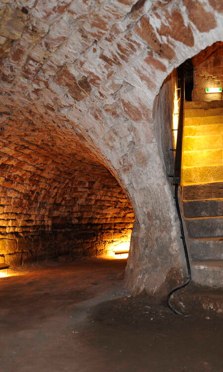 So speziell die Architektur, so unerwartet ist die Dimension der Anlage in der Tiefe. Die Räume für die Ausstellungen gehen über in unterirdische Wehranlagen aus dem Mittelalter und erstrecken sich über mehrere Etagen unter Schloss und Schlossplatz.