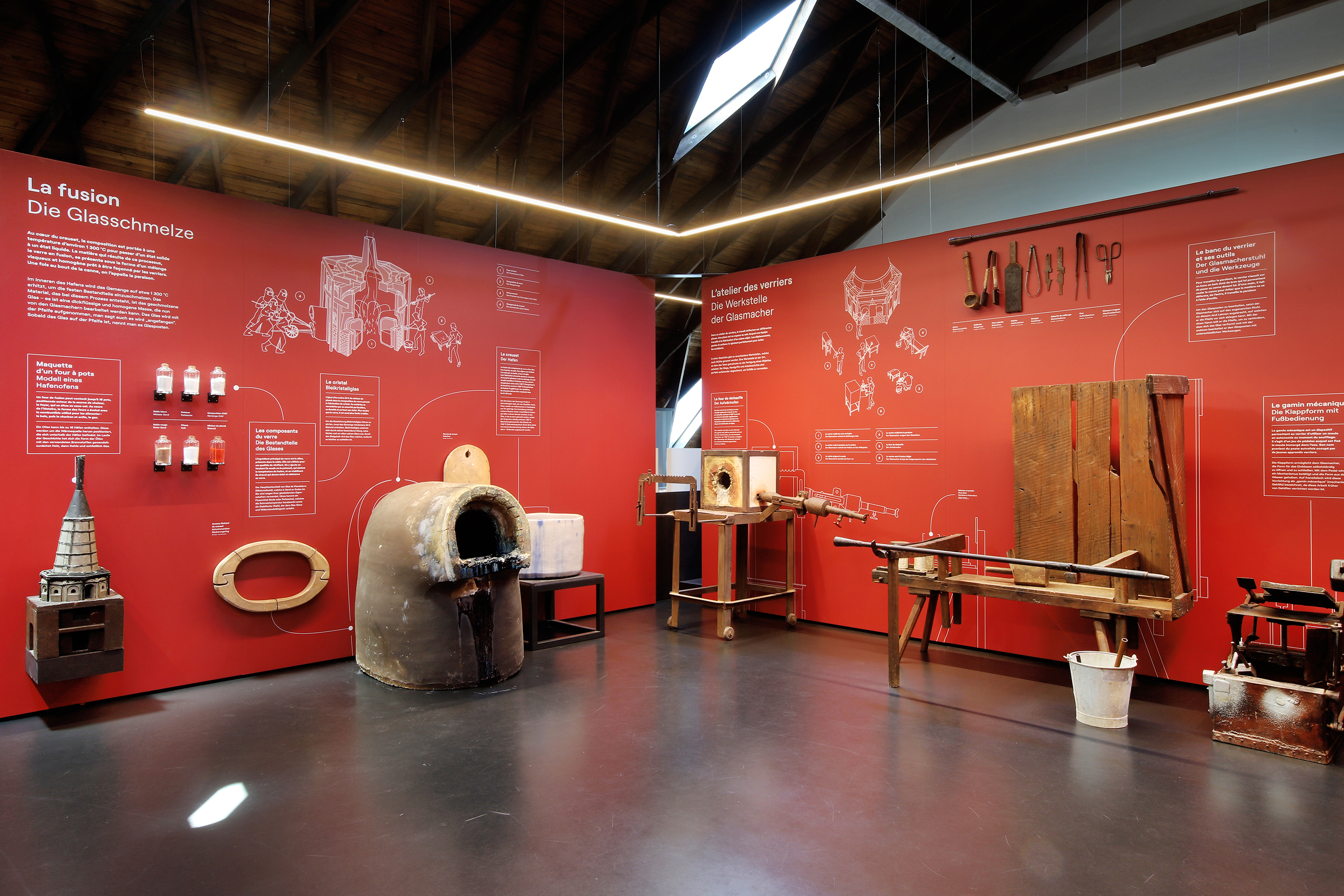 Die Präsentation umfasst 10 große Vitrinen und behandelt den Zeitraum von der Römerzeit bis in die Gegenwart. Themen sind zum Beispiel der Jugendstil in Meisenthal und die weltweit erste Anlage zur Erdölförderung in Pechelbronn. Seit Ende des 19. Jahrhunderts vertrieben Unternehmen aus dem Elsass und Lothringen ihre Produkte auch im Ausland, zum Beispiel gläserne Tischservice aus Meisenthal, blauen Farbstoff aus Buxwiller und gusseiserne Öfen von De Dietrich. Im 20. Jahrhundert lieferte die Hutmanufaktur Langenhagen in Sarre Union Stroh- und Panamahüte in über 80 Länder. Die Seilerei Dommel importierte Manilahanffasern aus den Philippinen zur Herstellung von Flachseilen.